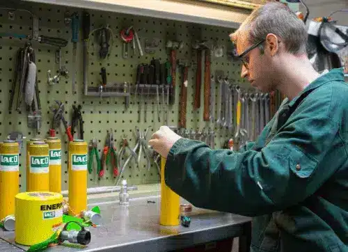 Veel voorkomende werkzaamheden bij het repareren van hydraulisch gereedschap zijn aanpassingen van het materiaal. Ook verbetering van plunjerassen, geleiders en de algehele werking zijn regelmatig terugkerende werkzaamheden. De cilinders worden volgens fabrieksspecificatie onderhouden, gerepareerd en getest. Wij beschikken over gekwalificeerde testapparatuur om onder andere pompdruk en statische vijzeldruk te meten.